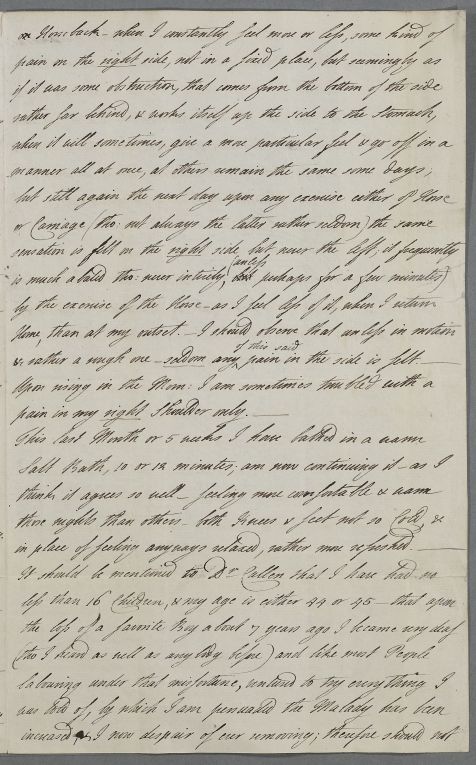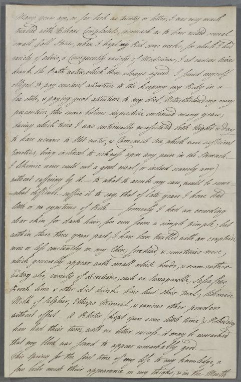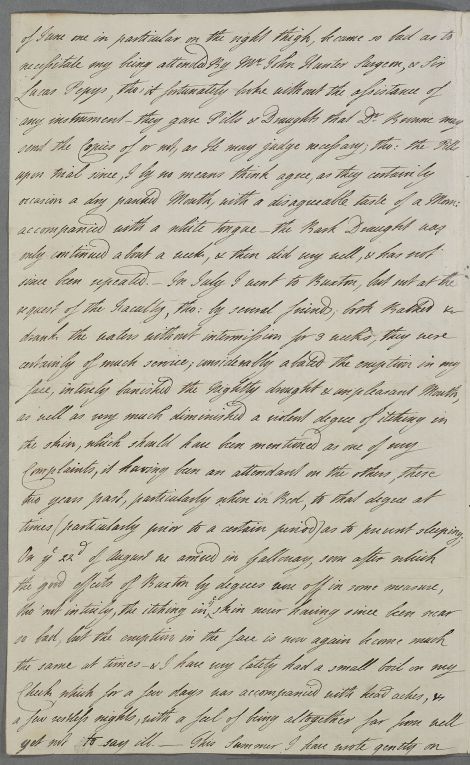 Case of Anne Dashwood, Countess of Galloway, who has had sixteen children, and who was often bilious when younger, but who now suffers from pimples, itchy skin, boils and varied pains in her side and her legs. |