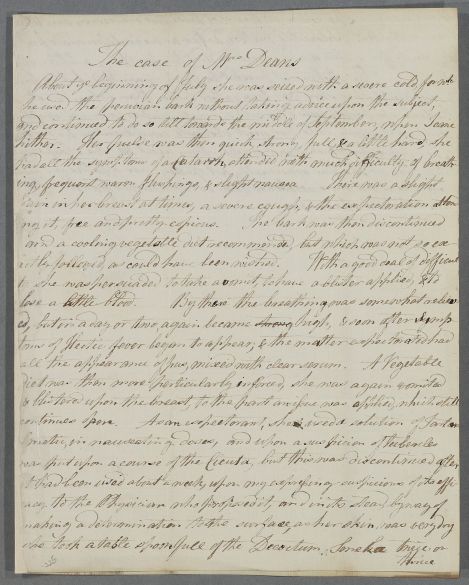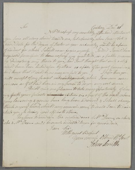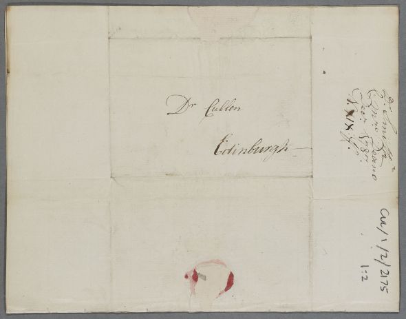 Letter from John Smith, a former student, thanking Cullen and saying that he would have 'expressed my gratitude in a public manner by dedicating my thesis to you had I not thought that such a step would have been looked upon by others as a piece of too great forewardness'. He encloses a case note, 'The Case of Mrs Deans' (his aunt), for whose repiratory ailment he seeks advice.