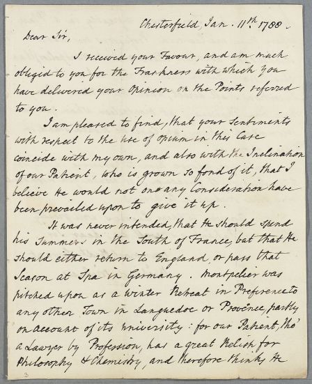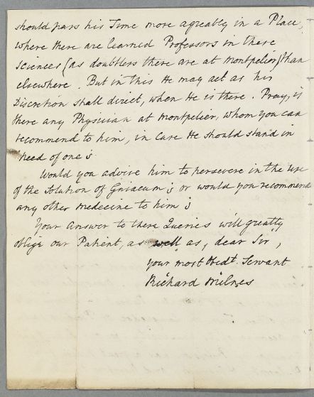 | Summary | Letter from Richard Milnes about [Mr Darrel] who will be wintering in Montpelier 'on account of its university for our patient, tho' a lawyer by profession, has a great relish for philosophy and chemistry'. |