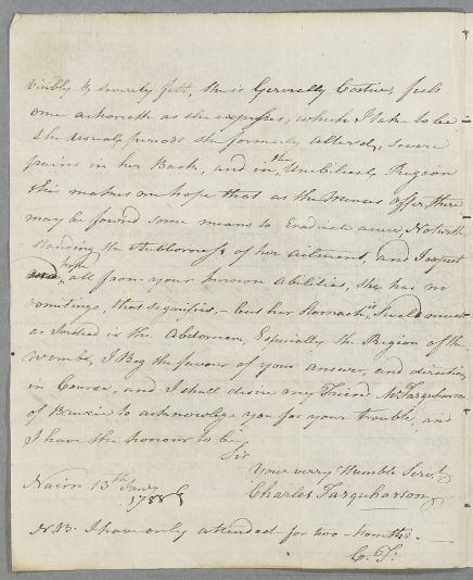 [ID:3296] From: Dr Charles Farquharson / To: Dr William Cullen (Professor Cullen) / Regarding: Anonymous (Patient) / 13 January 1788 / (Incoming)
