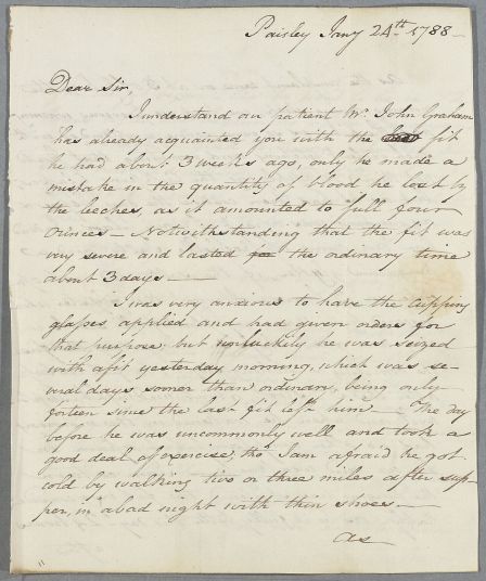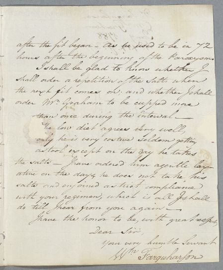| Summary | Letter from William Farquharson concerning the case of John Graham, who 'has already acquainted you with the fit he had about 3 weeks ago'. |