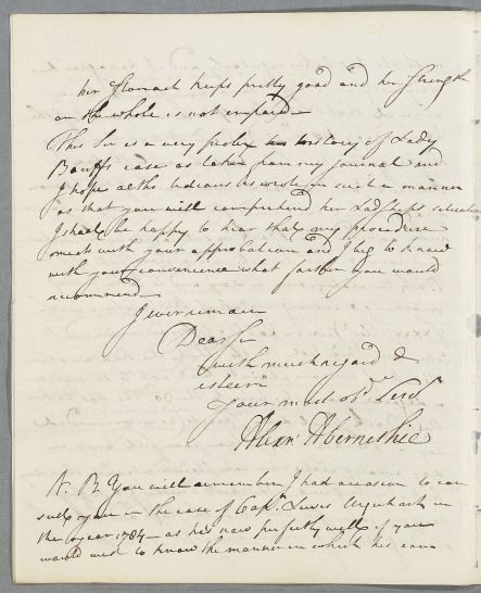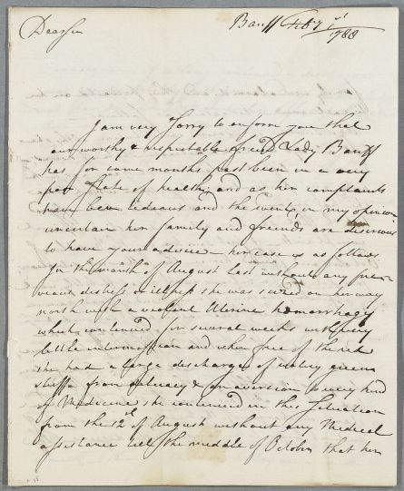 | Summary | Letter from Alexander Abernethie concerning the case of Lady Banff. Includes report on Captain Urquhart whose recovery he finds 'equally unaccountable as singular' and offers to send Cullen a letter from the surgeon of Urquhart's regiment with an account of his cure. |