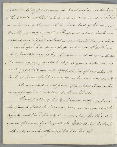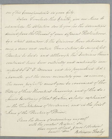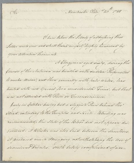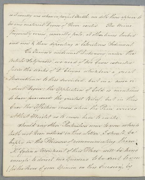 | Summary | Letter from Robinson Foxley, concerning the case of an unnamed clergyman, aged 60, in Manchester, who suffers from urinary tract problems. His most painful and pressing symptom is priapism. Foxley expresses his admiration for Cullen's publications, 'although the Doctrines therein contained have been critically and unkindly canvassed by Dr. J. Browne and his prejudiced adherents'. Payment is to be sent via a Manchester merchant, Mr. Ogden. |