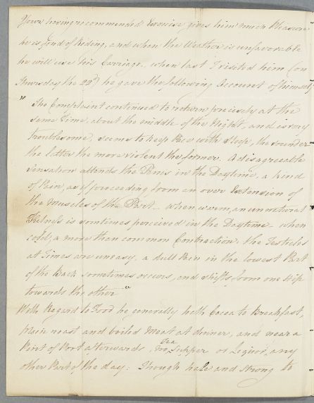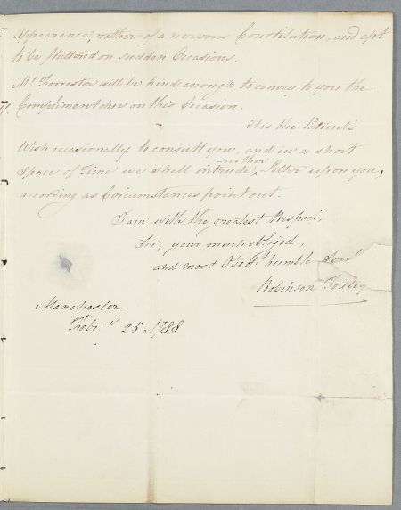 | Summary | Letter from Robinson Foxley, concerning the case of the unnamed Manchester clergyman who has priapism. Letter will be delivered by Mr Forrester from St Petersburg. Foxley observes that the patient is, 'Though hale and strong to appearance, rather of a nervous Constitution, and apt to be fluttered on sudden Occasions.' The annotation mentions that the answer has not been copied. |