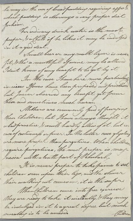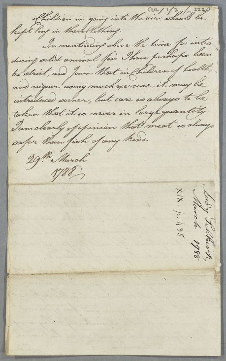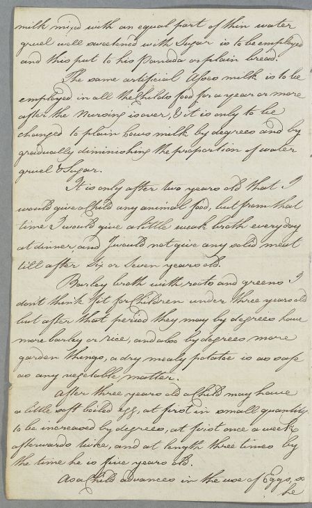 | Summary | Letter probably for Lady Selkirk(?), describing child-rearing practices in detail. Author - probably Cullen - believes cold bathing necessary, but 'Long nursing' beyond 9 months to be hurtful; describes the use of asses' milk and cows' milk, and feeding practices in the first years of life; the proper time to encourage children to walk; and their belief that purging is harmful. |