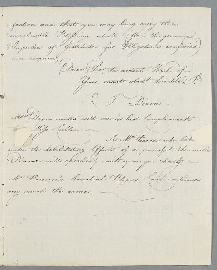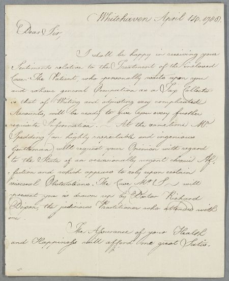 | Summary | Letter from J. Dixon, concerning the case of Mr Spedding. Also reports on Mr Harrison's health, and mentions that Mr Pearson will be consulting Cullen soon. Mentions an enclosed case note by Richard Dixon, but this seems to be missing. |