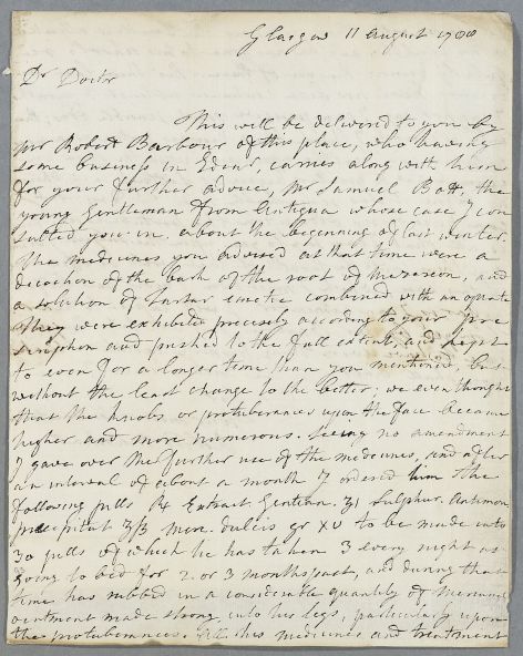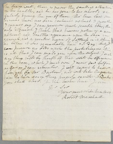 | Summary | Letter from Robert Marshall, concerning the case of Samuel Bott of Antigua, taken to see Cullen by Robert Barbour. |