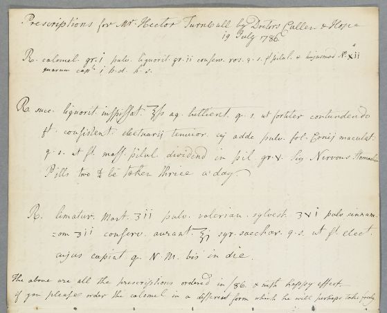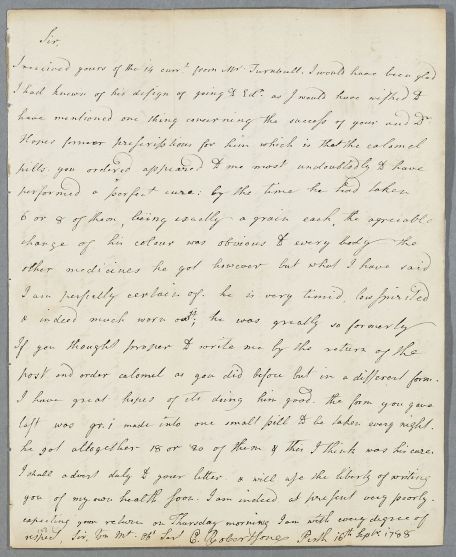 | Summary | Letter from C. Robertsone, Perth, concerning the case of Mr Turnbull. Includes a copy of a presecription previously sent for Turnbull by Cullen and Dr Hope. Roberstone himself is 'very poorly'. |