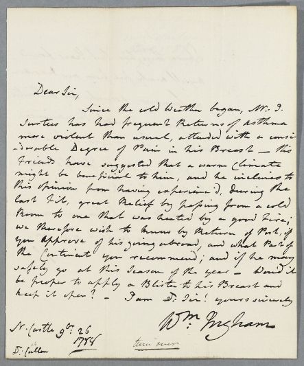 | Summary | Letter from William Ingham, concerning the case of John Surtees, whose asthma has returned with chest pains since the onset of cold weather. He asks Cullen's advice on travel abroad and on blistering. At the bottom, Surtees has written 'turn over', and written his piece on the reverse (Doc ID 3395). Again, Ingham uses '9th.' to mean the old 'ninth month', November. |