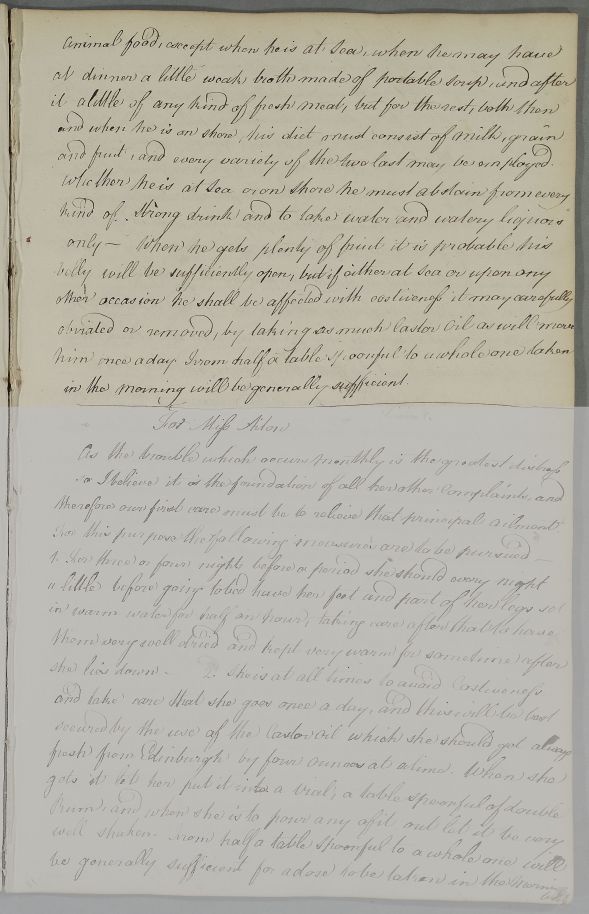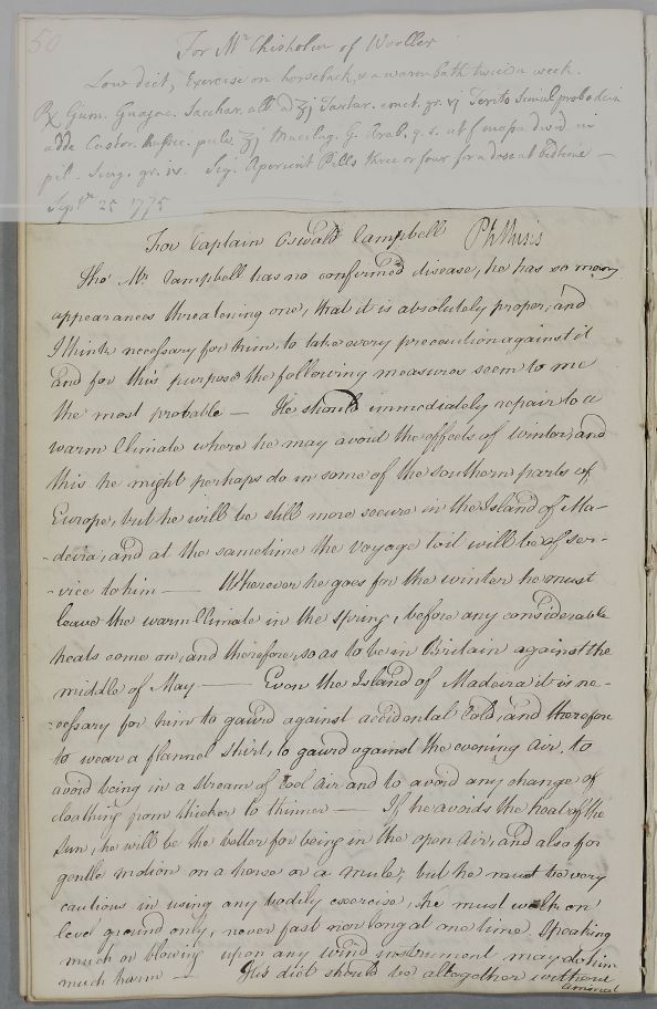 | Summary | Directions for Captain Oswald Campbell, who has no confirmed disease at present, but has 'so many appearances threatening one' that Cullen agrees it proper to take precautions. These involve him travelling to a warm climate before winter, avoiding cold air, and taking Castor oil. No obvious incoming letter. |