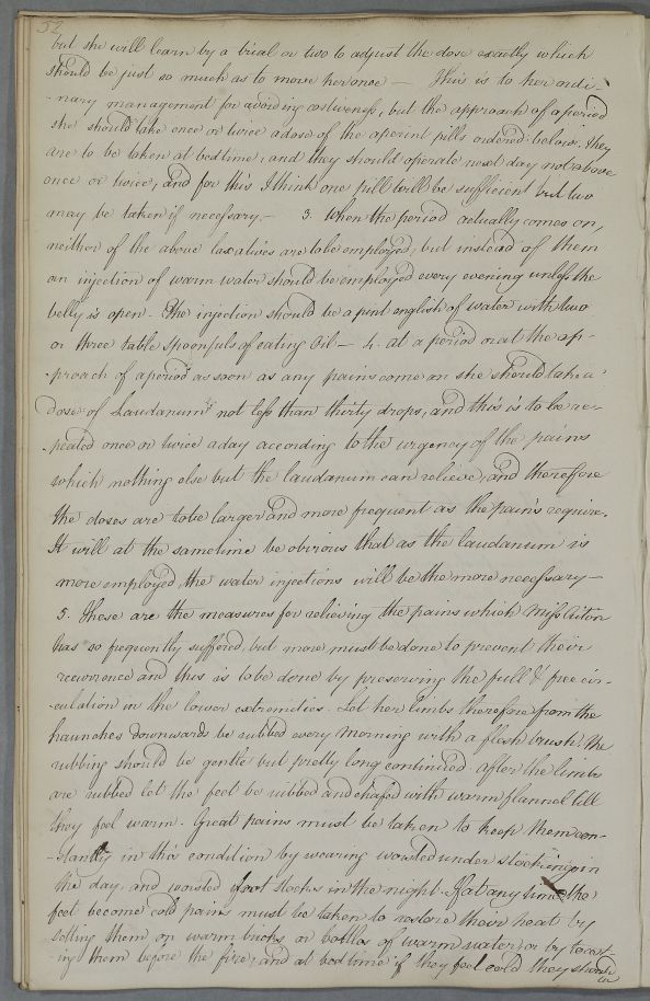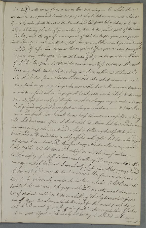 | Summary | Reply providing numbered directions for Miss Aiton regarding menstrual problems, for which a foot-bath, aperients and water injections are advised. She is also threatened with a respiratory disorder. The directions are in the form of a numbered list, and concern diet, exercise, and the avoidance of damp and moisture. A blister and perpetual issue on the painful part of her side are advised for her chest complaint. A Mr Eason has previously been consulted. A recipe for 'aperient pills' is included. |