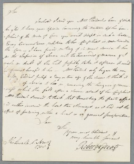 | Summary | Letter from Robert Groat, concerning the case of Mrs Riddoch. Consists of a covering letter and separate casenote. |