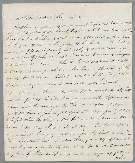 Case of Mrs Riddock [Riddoch] who has an unusual degree of heat occupying the epigastric and umbilical regions, which Cullen diagnoses as a nervous affliction of the stomach. |