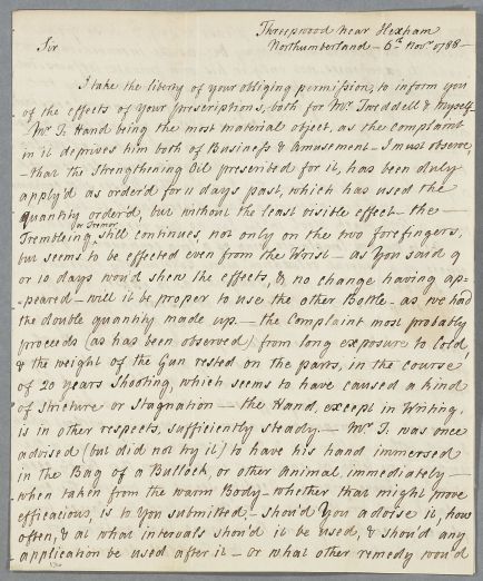 Case of Mr Tweedale [Tweedell], who has a weak, painful hand, which 'most probably proceeds...from long exposure to Cold, & the weight of the Gun rested on the parts, in the course of 20 years shooting'. |