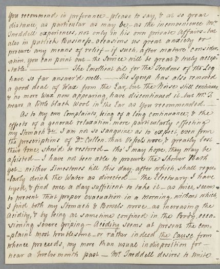 | Summary | Letter from J. Tweeddell, concerning both the correspondent's own case and the case of her husband Mr Tweedell. His illness is a weakness and pain in the hand, which 'most probably proceeds (as has been observed) from long exposure to Cold, & the weight of the Gun rested on the parts, in the course of 20 years shooting'. |