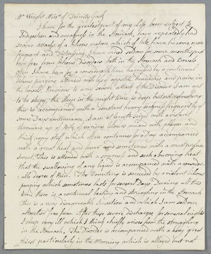 | Summary | Case note by Rev. Mr. Wright, Minister of Trinity Gask (near Auchterarder), describing his own case history of bilious and gastric ailments, with perspiration of the hands. It may be missing a covering note from a physician. |