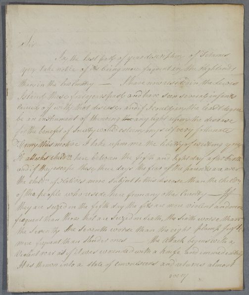 Letter from John Millar, Stornoway, a former student of Cullen's. He writes about Cullen's observation on tetanus being more common in the Highlands than the Lowlands. He has seen many children killed by it and offers his observations on the progress of the disease 'for the benefit of society'. Millar was a student of Cullen's.