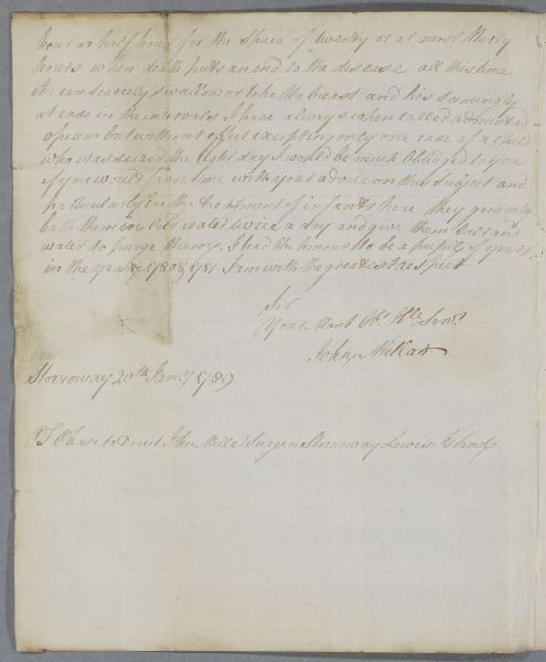 | Summary | Letter from John Millar, Stornoway, a former student of Cullen's. He writes about Cullen's observation on tetanus being more common in the Highlands than the Lowlands. He has seen many children killed by it and offers his observations on the progress of the disease 'for the benefit of society'. Millar was a student of Cullen's. |