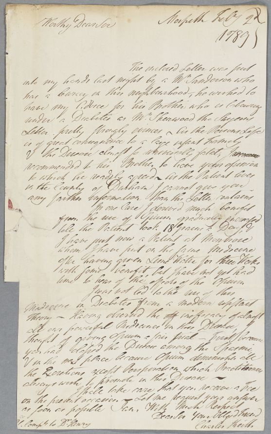 | Summary | Letter from Charles Keith, on the case of Mr Sanderson, who has diabetes. Covering letter by Keith enclosing a letter from Richard Sherwood of Staindrop. This letter had been addressed to Rev Mr Sanderson, Morpeth, who was the patient's brother, and who had passed the letter on to Keith. Previously the patient had objected to his case being put to a physician 'eminent in his Profession' but now allowed it. Keith discusses the use of opium in diabetes cases, and sends greetings to 'Dr Henry' (Cullen's son). The enclosure mentioned is Document 3457, linked in this case. |