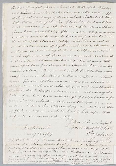 | Summary | Letter from William Guland to Henry Cullen concerning the case of an unnamed male patient 'who labours under the most obstinate Gonorrhoea I ever met with'. Illegible handstamp. |