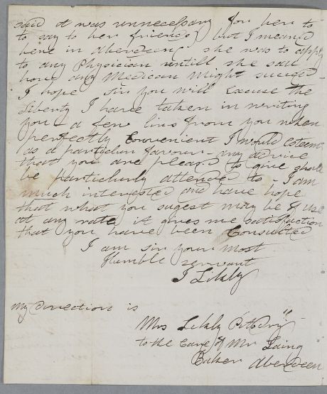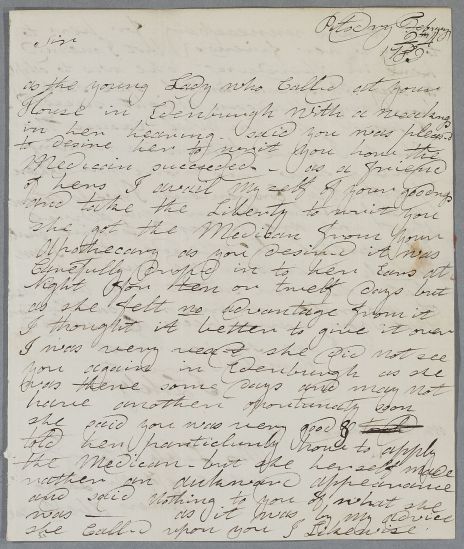 | Summary | Letter from Mrs J. Likly, concerning the case of 'the young Lady who Called at your House in Edenburgh with a weakness in her hearing'. |