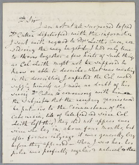 Letter from George Skene to John Bennet, Edinburgh, concerning the case of Mrs Leith. Document 3470, a case note, was included with this in the box but may have been sent earlier than this letter. Skene notes that Cullen was "dissatisfied with the information sent". Skene also refers to the French Oculist M. Jean Francois Pellier, who had visited Edinburgh, and the surgeon Benjamin Bell’s opinion of him.