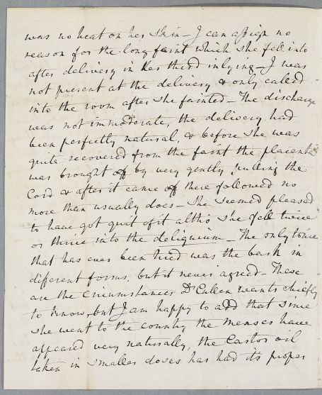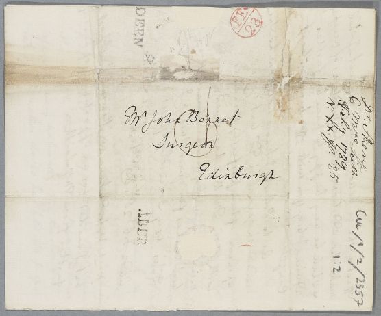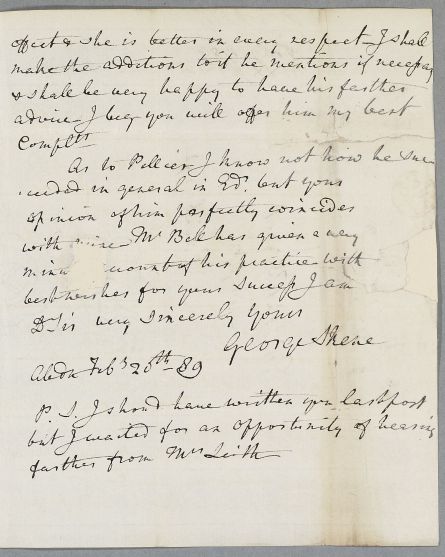 | Summary | Letter from George Skene to John Bennet, Edinburgh, concerning the case of Mrs Leith. Document 3470, a case note, was included with this in the box but may have been sent earlier than this letter. Skene notes that Cullen was "dissatisfied with the information sent". Skene also refers to the French Oculist M. Jean Francois Pellier, who had visited Edinburgh, and the surgeon Benjamin Bell’s opinion of him. |