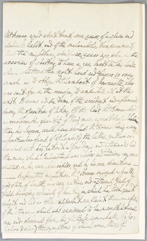 Letter from Fotherley Pannell, giving the full case history of William Bower, aged about 27, son of Mr Bower of Scorton. Formerly an attorney's clerk in London, 'living well and rather freely', he 'frequently sacrificed at the shrine of Venus' and contracted gonorrhœa. He had his right hand amputated by Lambert of Newcastle, after a shooting accident c. 1782, and has been in declining health ever since. He is now extremely emaciated, with severe breathing difficulties and cough, as well as digestive symptoms. Pannell had advised him to travel to Edinburgh to consult Cullen, but he is getting worse, according to a letter from his father, received last night and here transcribed for Cullen.