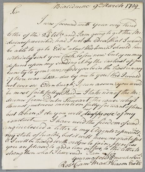 [ID:3477] From: Ensign Robert Campbell MacPherson (of Bialidmore or Bellidmore near Ruthven, Captain McPherson) / To: Dr William Cullen (Professor Cullen) / Regarding: Ensign Robert Campbell MacPherson (of Bialidmore or Bellidmore near Ruthven, Captain McPherson) (Patient) / 9 March 1789 / (Incoming)