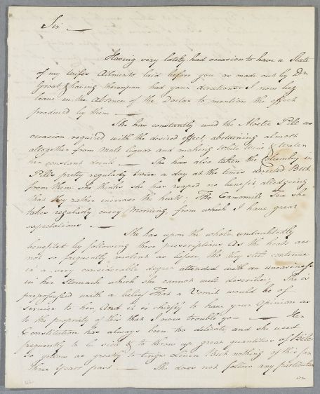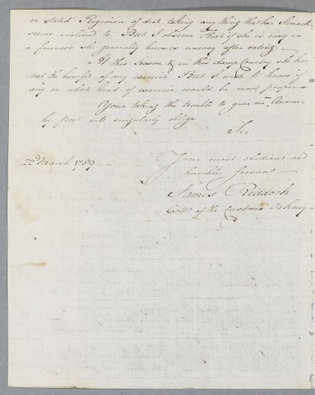 | Summary | Letter from James Riddoch, Collector of the Customs, Orkney, concerning the case of Mrs Riddoch, as previously put before Cullen by Dr Groat (see 3418). |