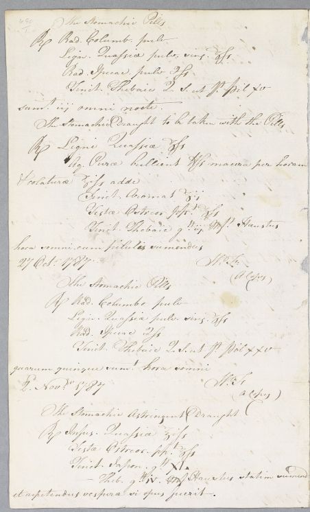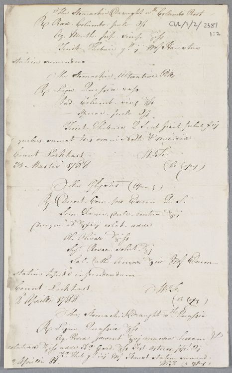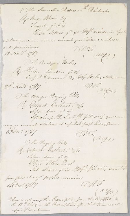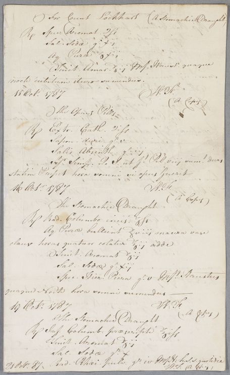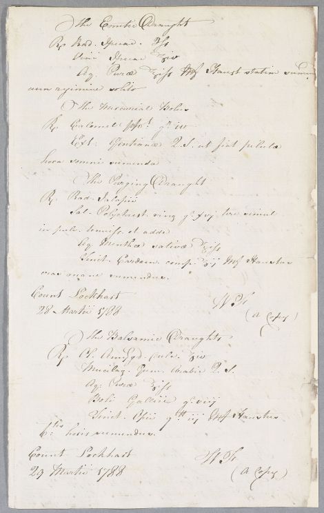 | Summary | List of various recipes written for Count Lockhart. Indexing on reverse gives a date of March 1789. All of them are initialled 'W. F.' A list of 20 recipes given to Count Lockhart between 15 Oct 1787 to 2 Apr 1788. Note after recipe for 14th Dec. says: "There is not any other Præscription from the last Date to the 12th. Feby. the Præscriptions after that time are all copied & sent". |