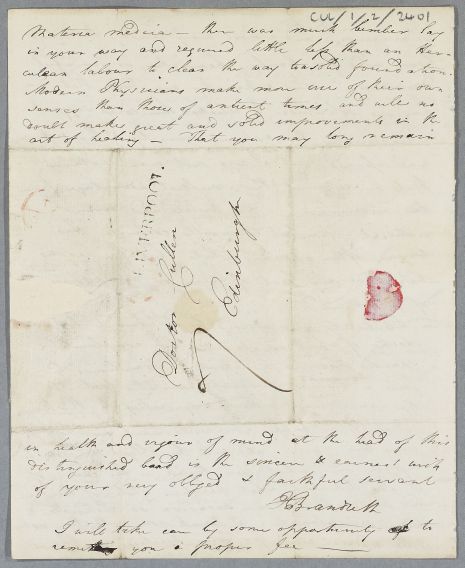 | Summary | Letter from H. Brandreth, concerning the case of Mr K. Mentions that Dr Percival has also attended the patient, and he advised electricity. Author is Dr. J. Brandreth - writing and signature was compared with letter 1513. Dr Brandreth praises Cullen on his treatise on the Materia Medica. |