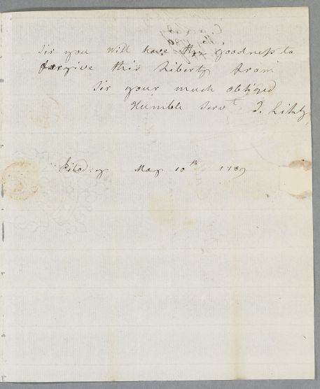 [ID:3510] From: Miss I. Likly / To: Dr William Cullen (Professor Cullen) / Regarding: Miss I. Likly (Patient) / 10 May 1789 / (Incoming)