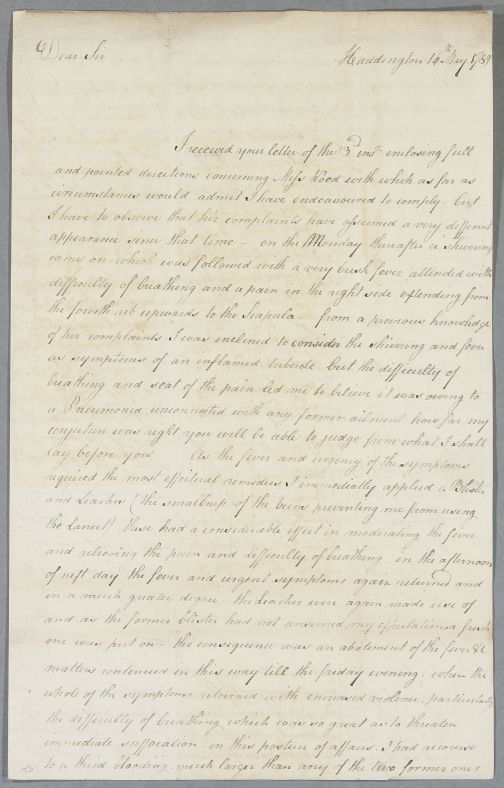 [ID:3516] From: Dr Robert Somerville / To: Dr William Cullen (Professor Cullen) / Regarding: Miss Wood (Patient) / 16 May 1789 / (Incoming)