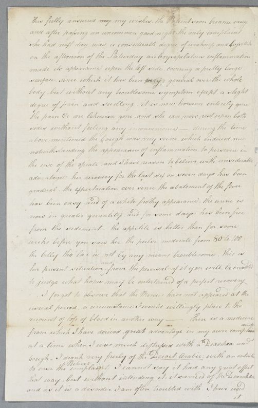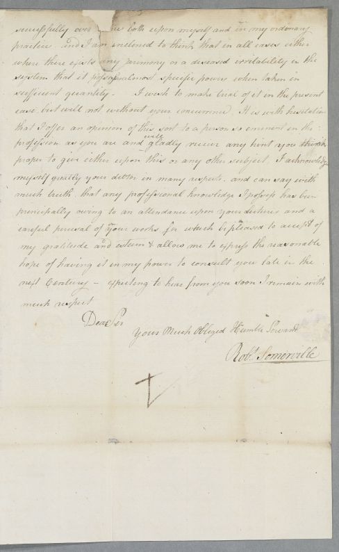 | Summary | Letter from Robert Somerville, concerning Miss Wood, whose condition has improved following a bout of pneumonia, which he has treated with bleeding and blistering. He also mentions using the Arabic Decoction when he suffered from cough and diarrhœa himself, and seeks advice from Cullen (whose student he was) on using it in this case. |