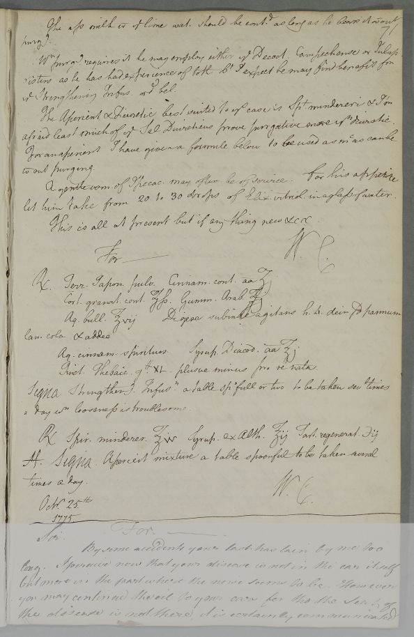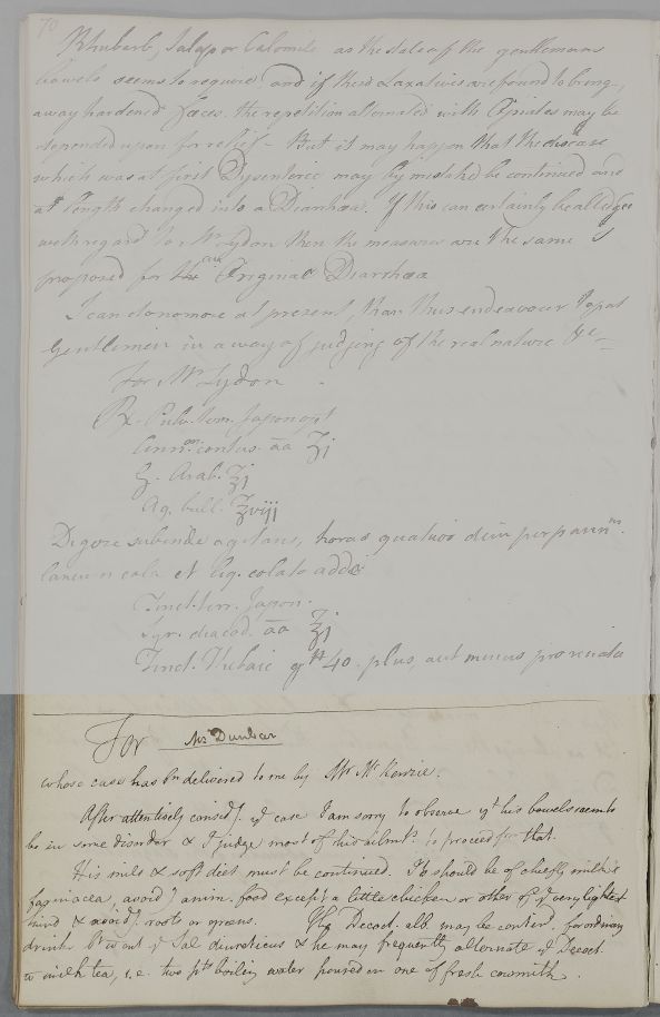 | Summary | Reply 'For ___, whose case has been delivered to me by Mr McKenzie'. 'Mr Dunbar' is added in another hand; it probably refers to Robert Dunbar, which implies it is to be sent to Dr Andrew Liddell. Cullen believes the ailments to result from a disorder of the bowels. He gives dietary advice and discusses the use of purgatives and other medicines. There are two recipes: a strengthening infusion and an aperient mixture. |