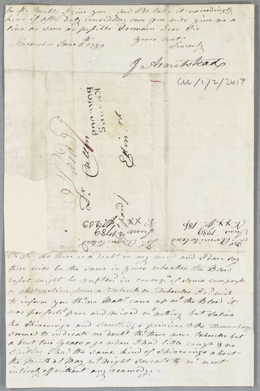 [ID:3527] From: Dr John Armitstead / To: Dr William Cullen (Professor Cullen) / Regarding: Dr John Armitstead (Patient) / 5 June 1789 / (Incoming)