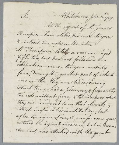 | Summary | Letter from Lancelot Aery, concerning the case of James Thompson who had been a seaman 'in the Virginia trade'. |