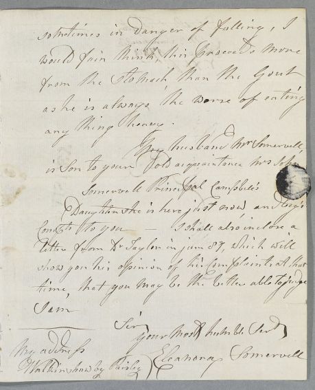 Letter from Eleanora Somervill concerning the case of Neil Somervill. She also writes that her husband is the son of Mrs James Somervill, Principal Campbell's daughter. Enclosure identified as Letter 3534.