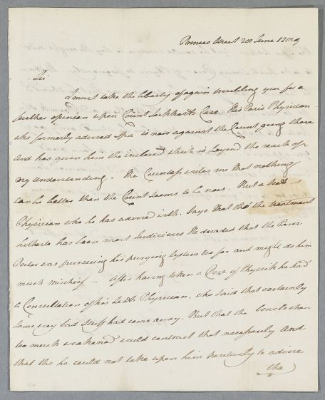| Summary | Letter from John Wauchope, concerning the case of Count Lockhart. He writes that his Paris physician had previously prescribed a spa but was now against the idea. Another Scots physician was concerned that the purging system might be too severe. |