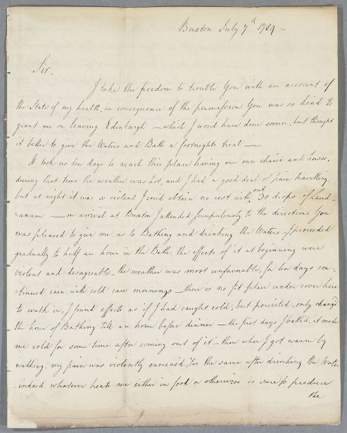 | Summary | Letter from Charles Wedderburn, concerning his own case. Wedderburn's account of his experience with Buxton Water. His wife was unwell and was seen by Dr Denman there. |