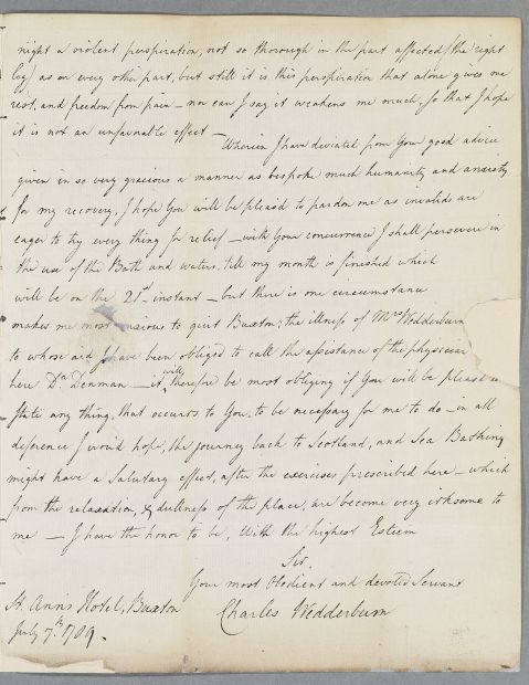 [ID:3550] From: Captain Charles Wedderburn / To: Dr William Cullen (Professor Cullen) / Regarding: Captain Charles Wedderburn (Patient) / 7 July 1789 / (Incoming)