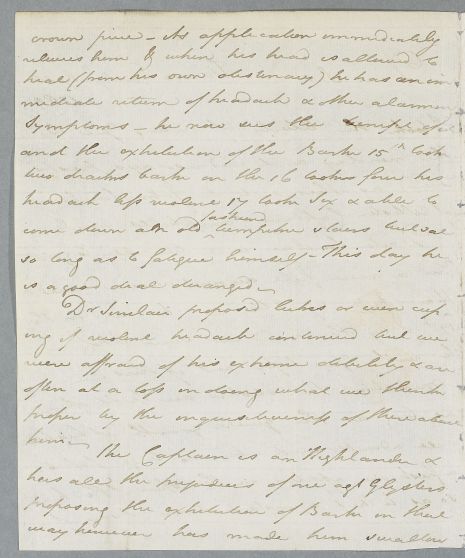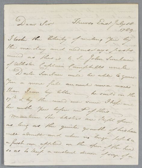| Summary | Letter from William Sinclair concerning the case of Captain Campbell. He writes that Dr Sinclair will be having to give a fuller account. He hopes for advice from Cullen and Dr Monro. "I have this day transmitted, [the] case of Mr McLeod at Murkle marked XYZ by his direction ...". Unable to locate this patient or case. |