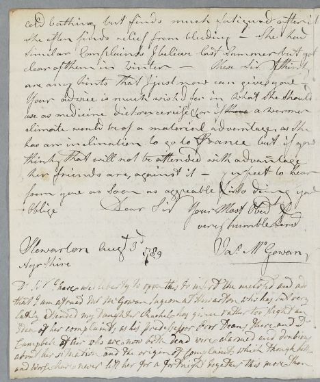 [ID:3568] From: Mr James MacGowan (McGowan) / To: Dr William Cullen (Professor Cullen) / Regarding: Miss Rachel Dunlop (Patient) / 3 August 1789 / (Incoming)