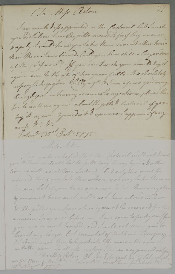 [ID:357] From: Dr William Cullen (Professor Cullen) / To: (Miss Aiton's physician or surgeon) / Regarding: Miss Aiton (Patient) / 31 October 1775 / (Outgoing)