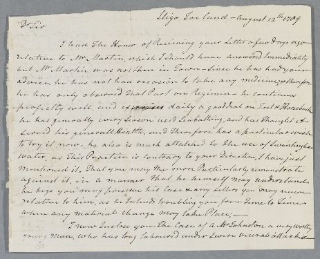 [ID:3572] From: Mr Andrew Todd (in Sligo) / To: Dr William Cullen (Professor Cullen) / Regarding: Reverend Cowper (Revd. Mr Cowper/Cooper) (Patient), Mr John Martin (Patient), Mr Johnston (Patient) / 12 August 1789 / (Incoming)
