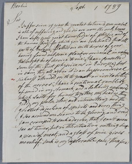 Letter from Mr Cowmeadow, 'Lecturer of her Late Royal highness princes Amelia at Berlin', concerning his own case. He has suffered for 19 years with 'an hypocondriacal sickness attended with to great an irritability of the nerves', which affect his stomach, head and spirits. He refers to it as 'this many headed hydrae', for which he has consulted many physicians in Europe.