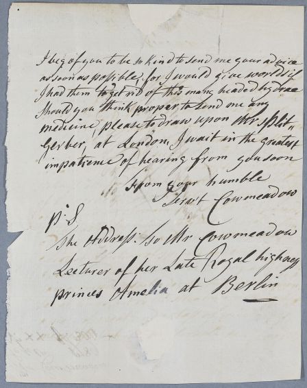 | Summary | Letter from Mr Cowmeadow, 'Lecturer of her Late Royal highness princes Amelia at Berlin', concerning his own case. He has suffered for 19 years with 'an hypocondriacal sickness attended with to great an irritability of the nerves', which affect his stomach, head and spirits. He refers to it as 'this many headed hydrae', for which he has consulted many physicians in Europe. |