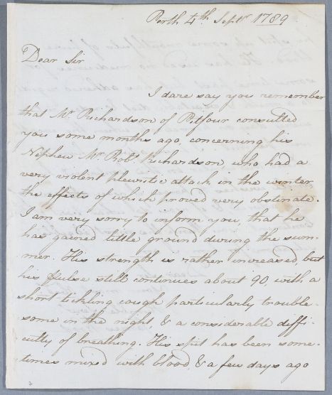 [ID:3581] From: Dr James Wood (of Keithick) / To: Dr William Cullen (Professor Cullen) / Regarding: Mr Robert Richardson (Patient) / 4 September 1789 / (Incoming)