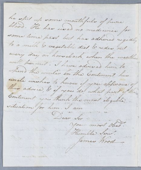 | Summary | Letter from James Wood concerning the case of Robert Richardson, nephew of Mr Richardson of Pitfour, Perthshire. He is now coughing up pure blood, and Wood and Mr Richardson request Cullen's approval of a plan to send him to the Continent for the winter. |